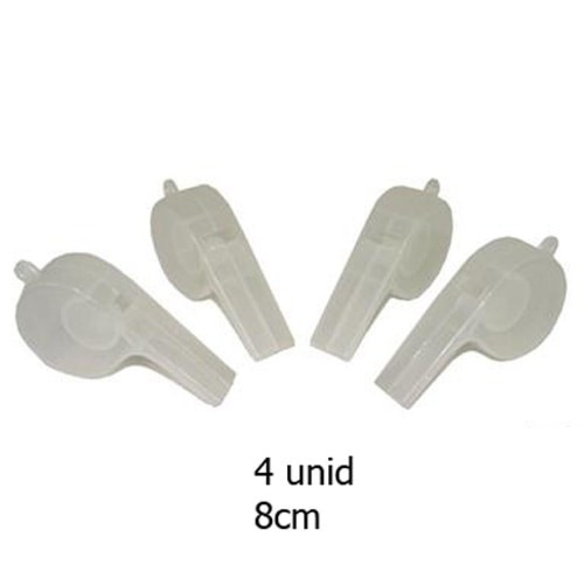 Pack composto por 4 apitos de 8cm, que brilham no escuro. Ideal para festas e festivais.Envios