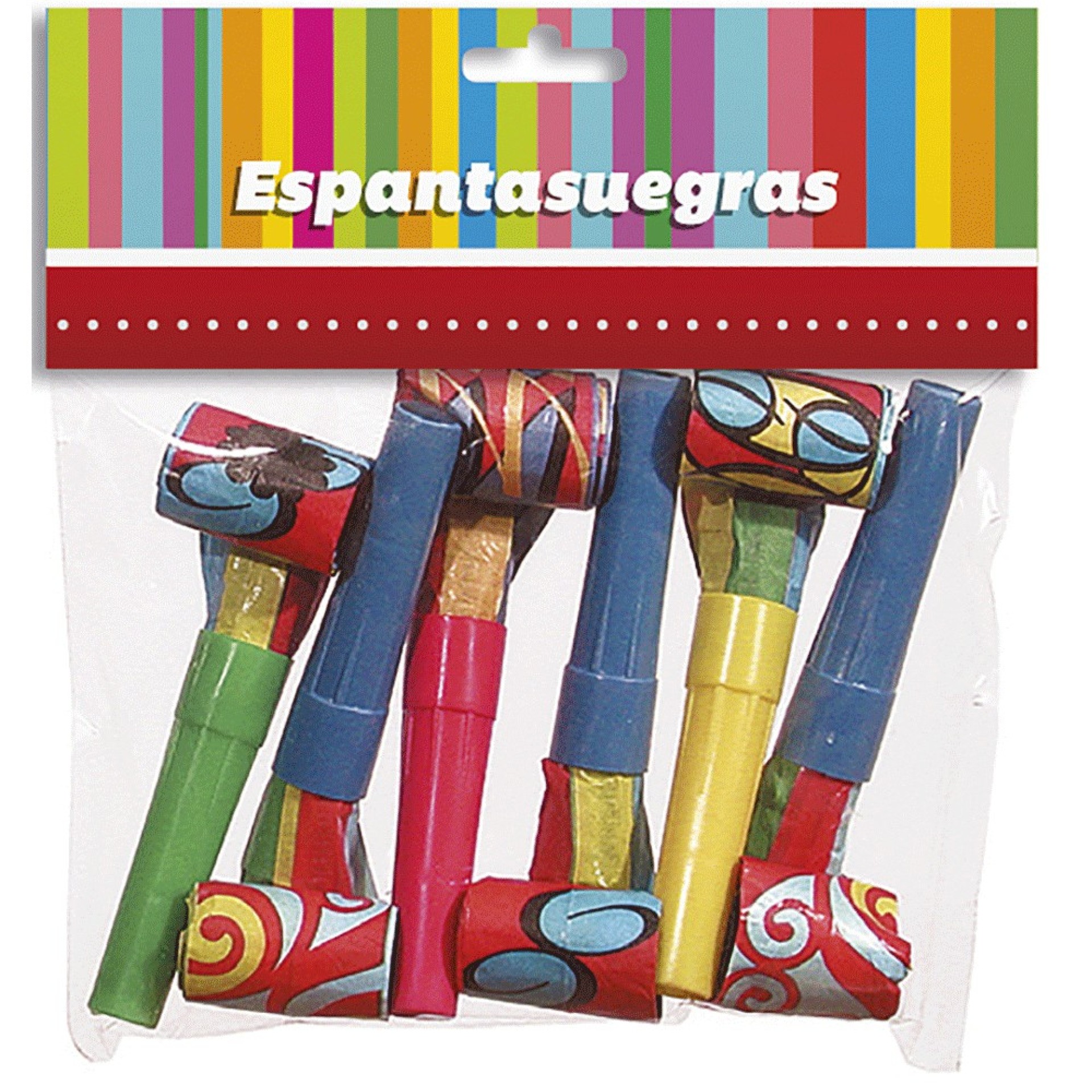 Pack com 6 Línguas da Sogra. Apito em plástico e língua em papel colorido.Advertências