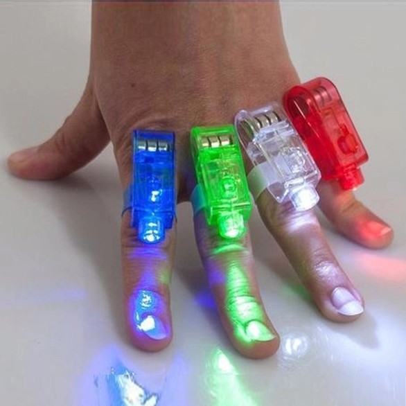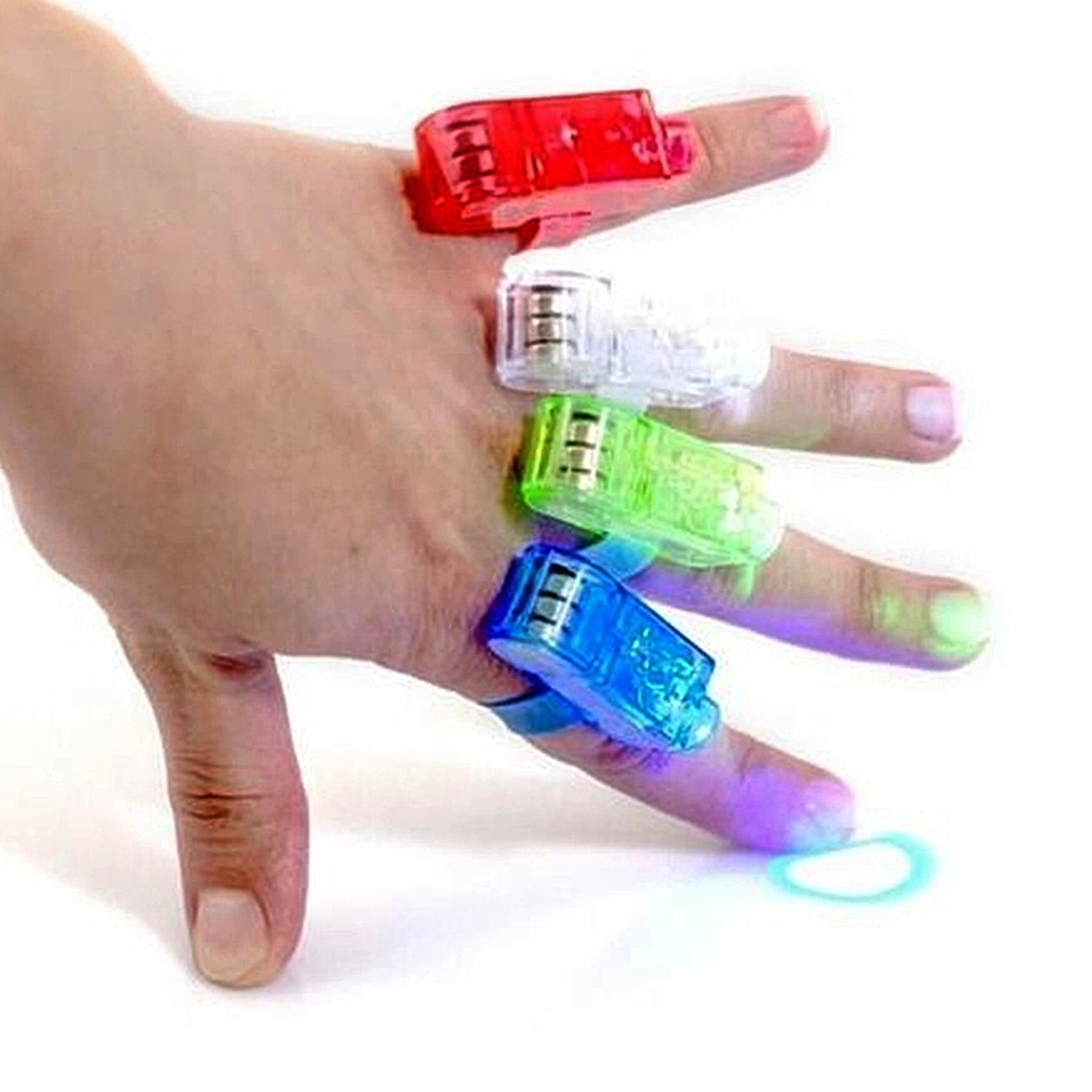 Sucesso garantido na sua festa! Coloque uma luz em cada dedo, prendendo com o elástico e divirta-se com estas mini lanternas! Vendidos em conjuntos de 4 unidades - branco, verde, vermelho e azul.Envios