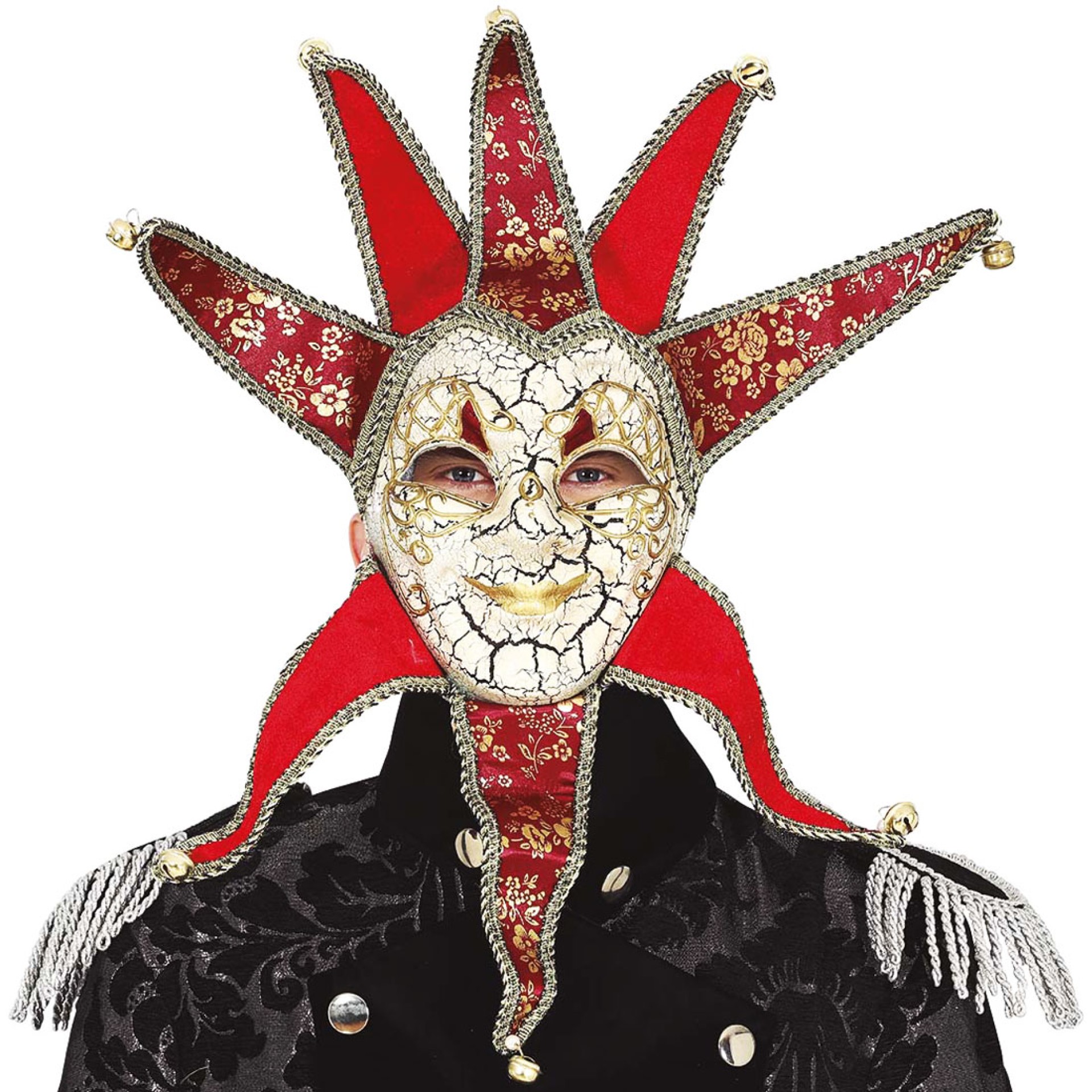 Elegante máscara veneziana para homem, em plástico duro. Tecido aveludado,toda debruada a fitas douradas, termina com guizos nas pontas. Vem brincar ao Carnaval com elegância e requinte.Dados Técnicos