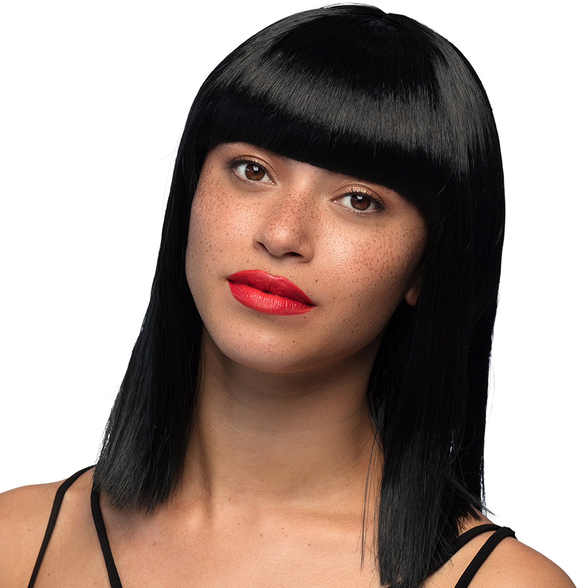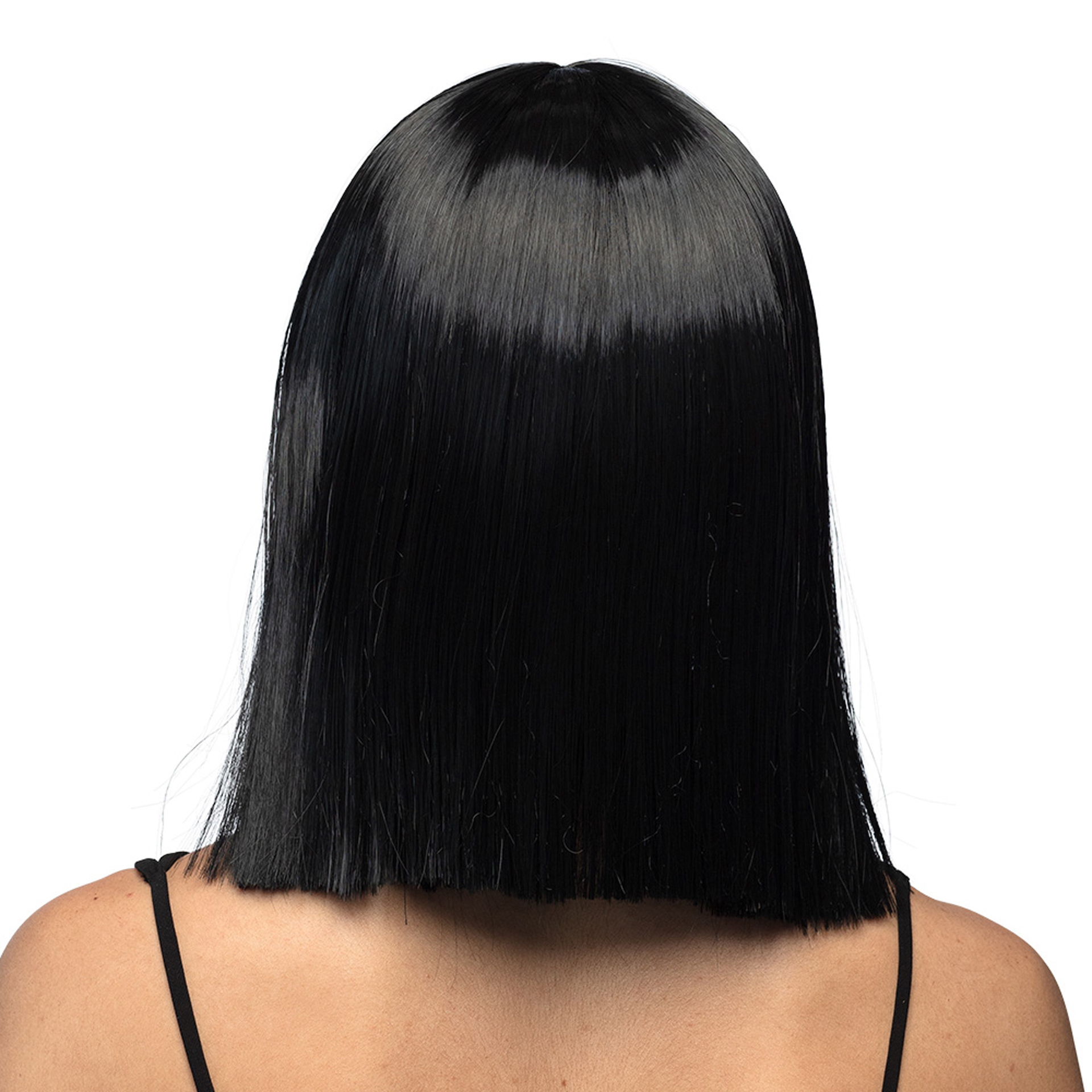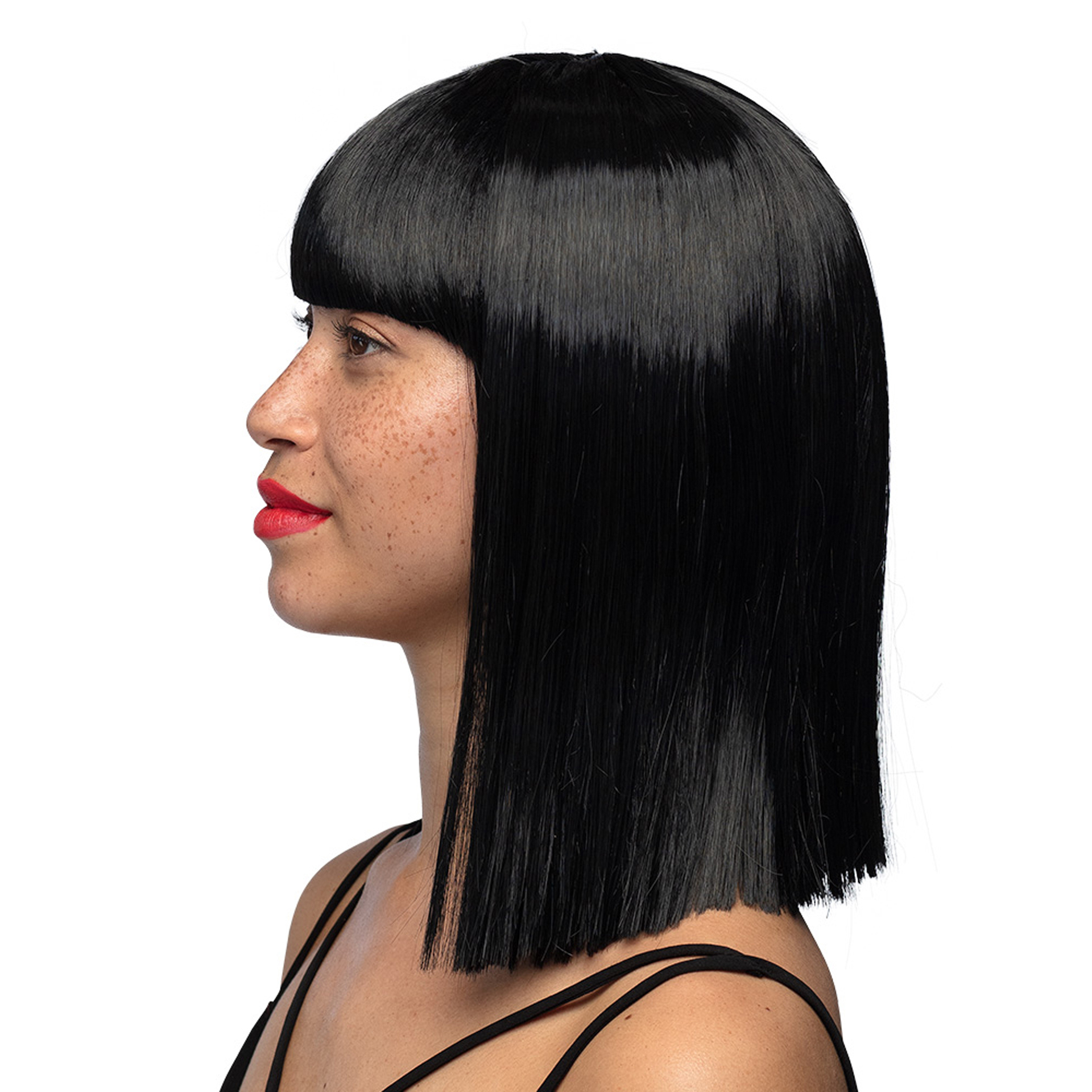 Peruca com desnível, mais curta a trás e mais comprida à frente. Pode servir para disco, egipcia, etc.Dados Técnicos