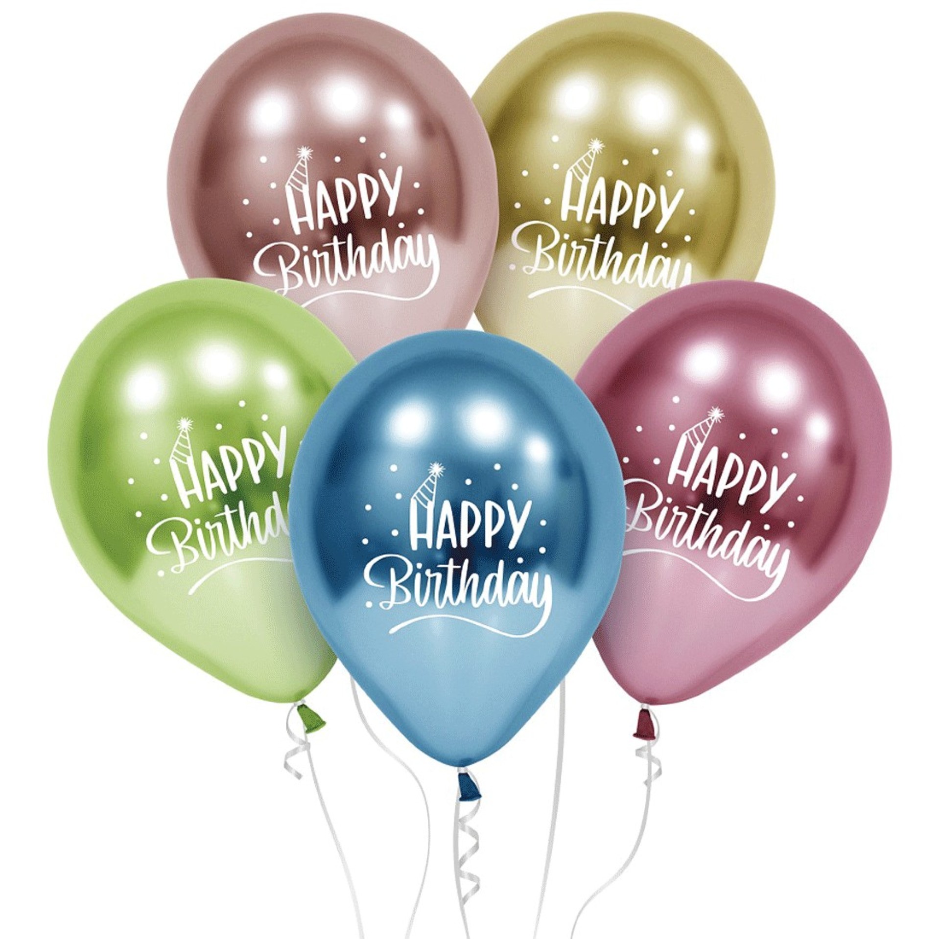 Pack com 5 balões Happy Birthday Chrome. Podem encher-se com arou hélio (não incluído).Advertências