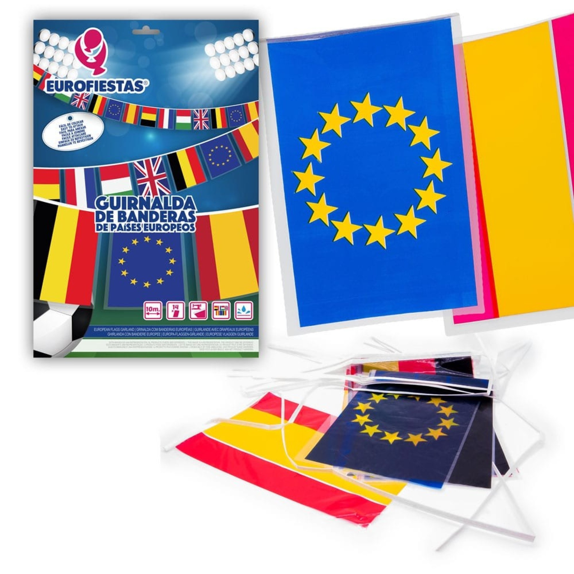 Bandeirolas em plástico dos países da Europa com 10m (14 bandeiras). Países: Espanha, Alemanha, Reino Unido, Bélgica, França, Italia, União Europeia.Advertências