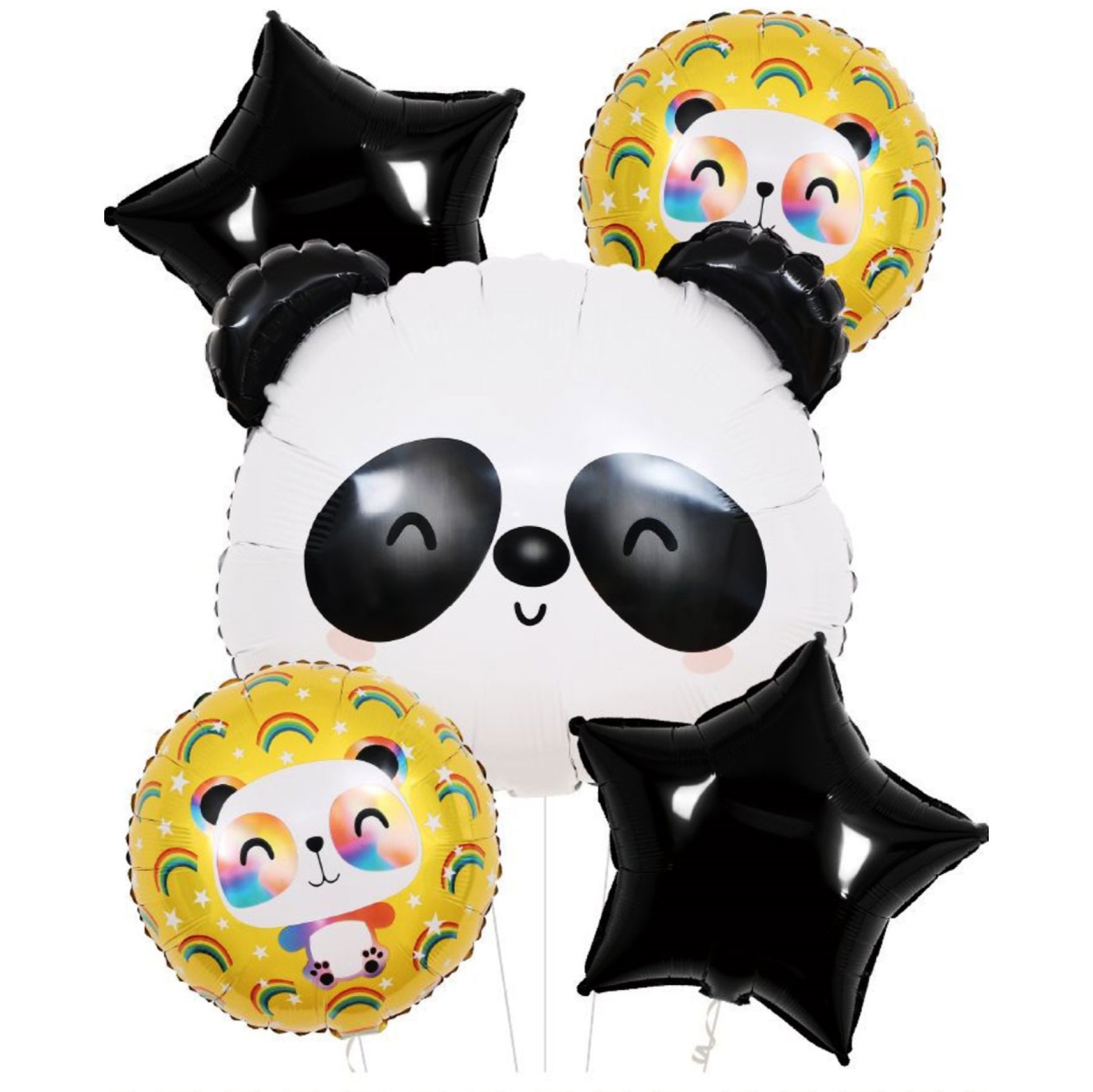 Pack com 5 balões em foil. Inclui 1 balão cabeça de panda com 57cm, 2 balões redondos do panda com 45cm e 2 estrelas pretas com 40cm. Podem encher-se com ar ou hélio (não incluído).Advertências