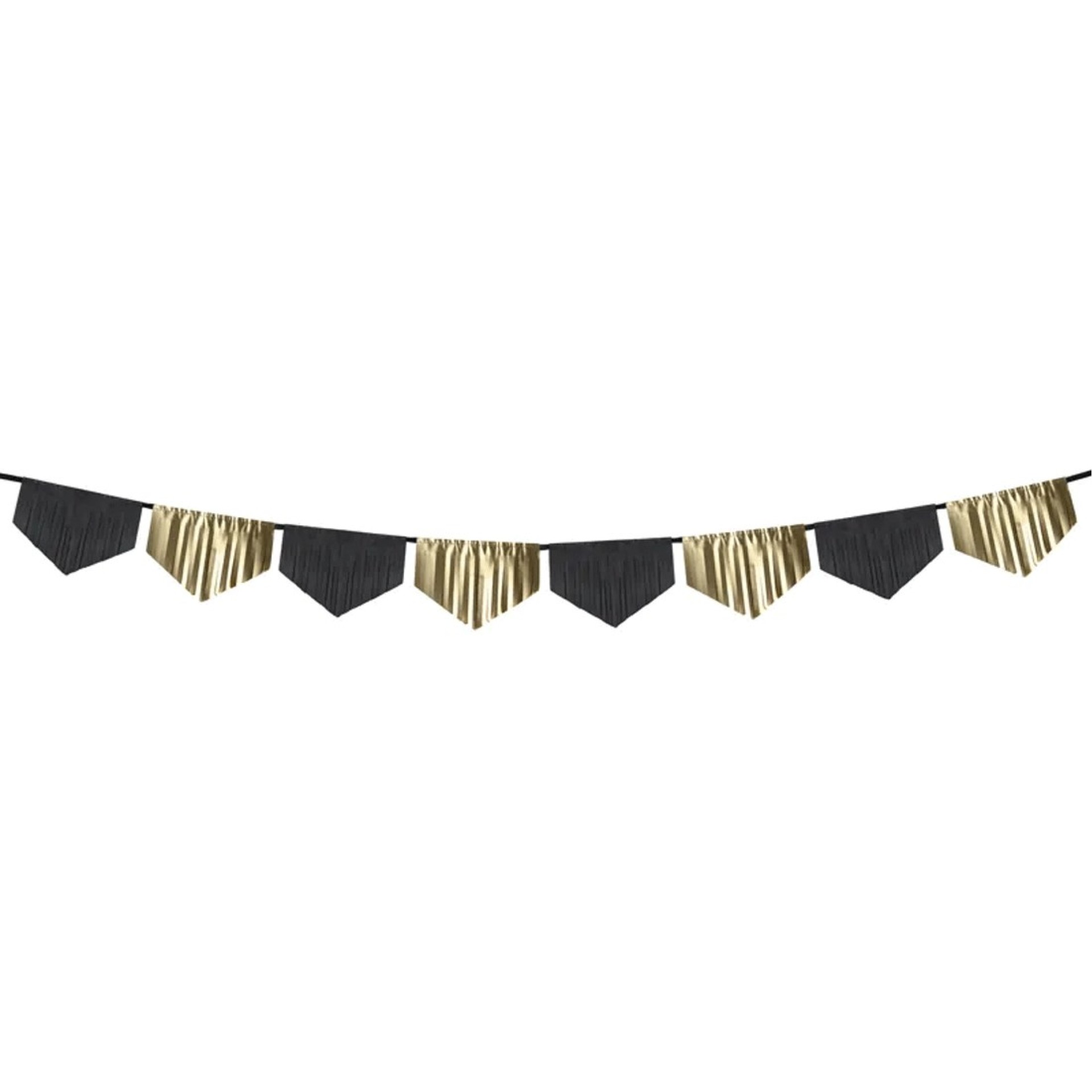Grinalda Black and Gold em papel e foil com cerca de 3 metros. Cada bandeirola mede 18,5X25cm.Advertências