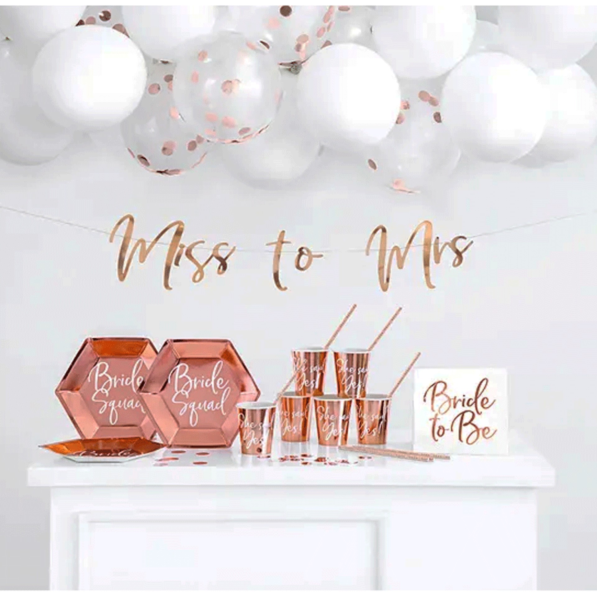 Kit de mesa Miss To Mrs composto por 1 banner, 1 saco de confettis, 10 palhinhas, 20 guardanapos, 6 pratos, 6 copos e 16 balões em latex.Advertências