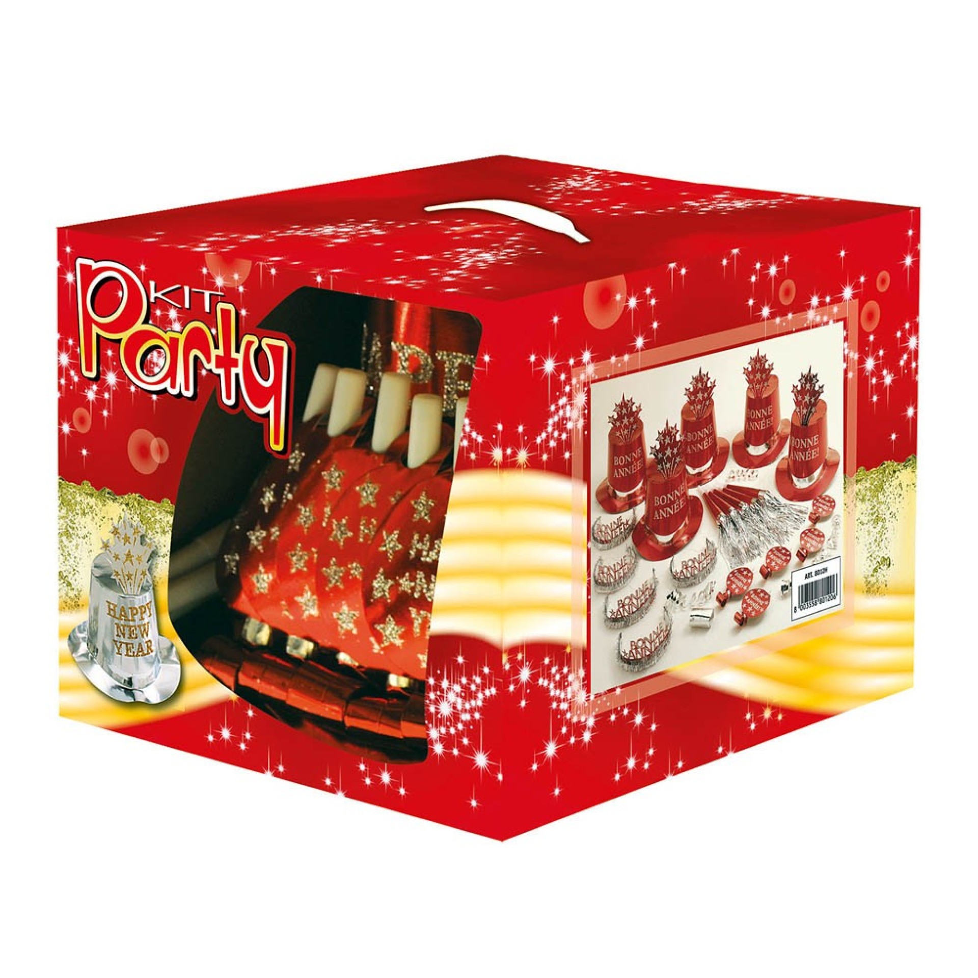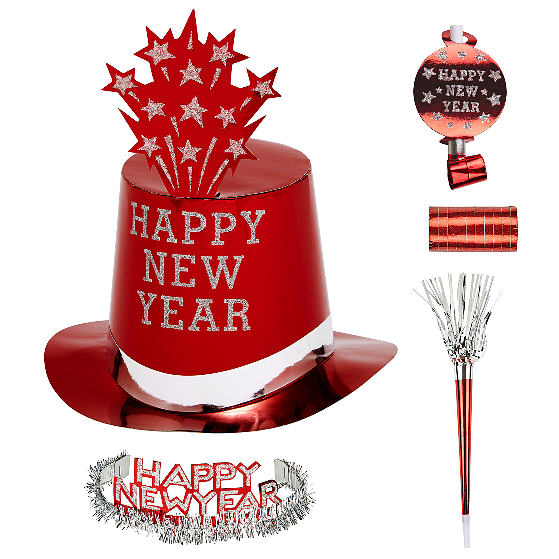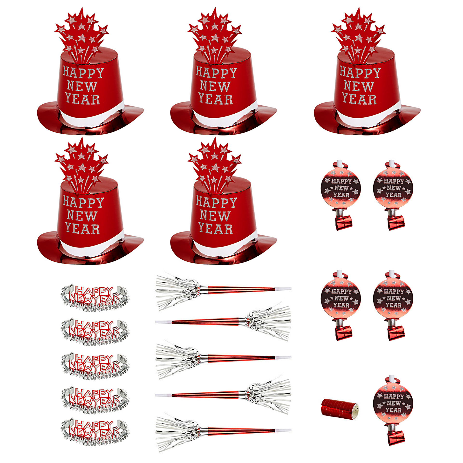 Kit Fim Ano LuxRed 10Pax composta por 5 chapéus, 5 coroas, 5 línguas da sogra, 5 cornetas e 1 rolo com 10 serpentinas.Advertências
