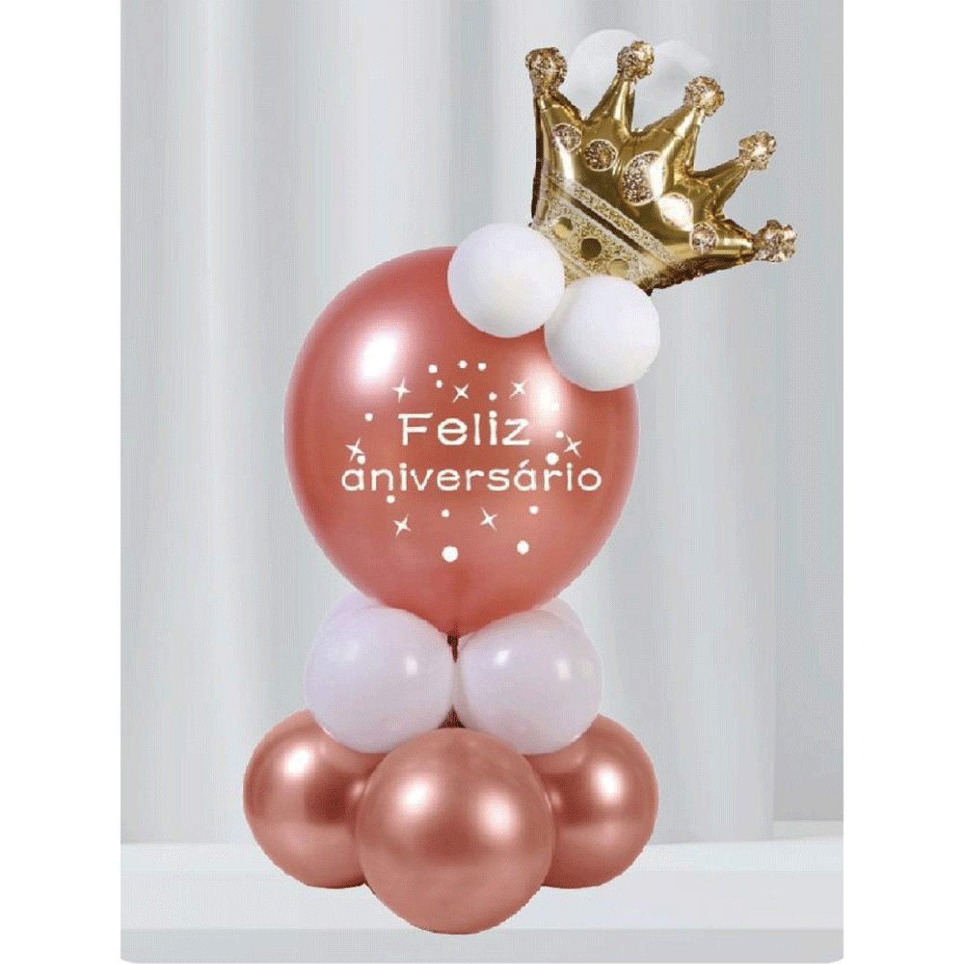 Mini Coluna Rose Gold composta por 1 balão coroa com 30cm para encher com ar, 1 balão impresso com 45cm, 4 balões em latex rose gold, 7 balões brancos em latex e adesivos para colar os balões.