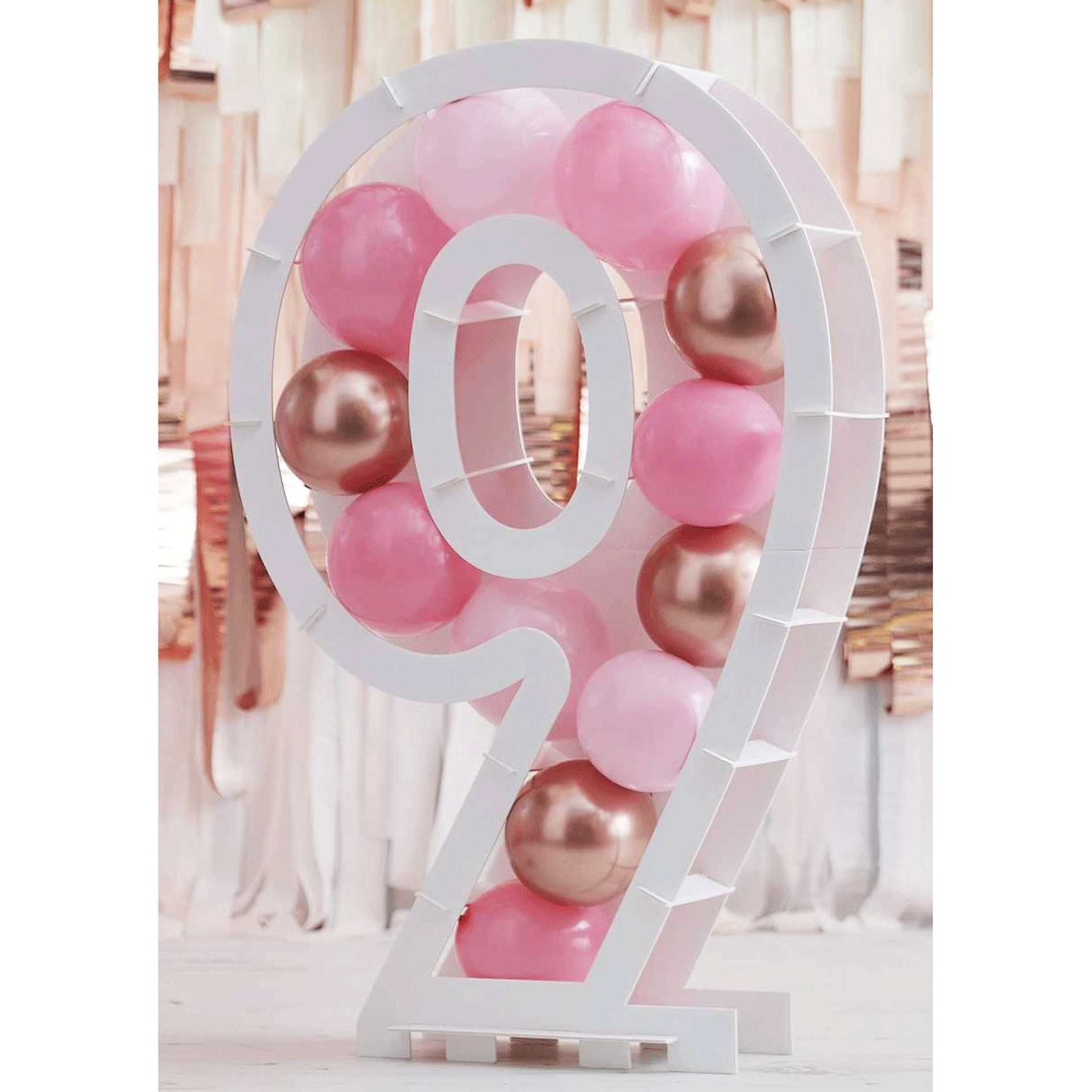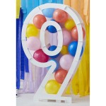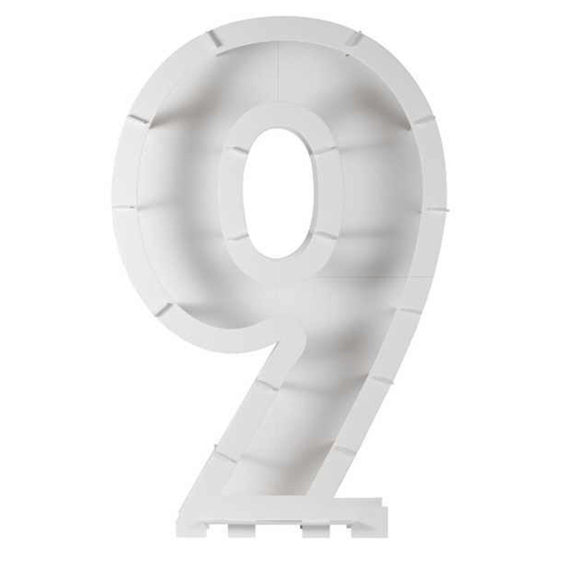 Moldura Numero 9 Para Balões com 81cm. Leve e fácil d montar. Cada pacote contém:1 x Suporte de Balão Número 0 medindo 81cm (A) 58cm (L) 14cm (P)Almofadas de espuma adesiva forte em 2 tamanhos e suportes de suporte de espuma incluídos para fácil montagem. Esses quadros são projetados para uso único. Atenção: Balões não incluídos.Instruções de montagem: desdobre as placas de espuma da moldura cuidadosamente retire os quadros de balão, suportes laterais, suportes de base e tenha as uniões de cartão prontas.Na parte de trás de cada moldura, coloque uma união sobre as linhas de vinco para segurar e colocar em segurança.Empurre os pequenos pés da moldura 1 através de um lado do suporte da base.Junte as estruturas 1 e 2 encaixando as barras de suporte laterais nas ranhuras ao redor da borda.Pegue na moldura 3 e repita o mesmo processo com as barras laterais restantes para o centro do seu número. Assim que a moldura estiver estável e segura encha balões de 5 polegadas e coloque dentro da moldura.