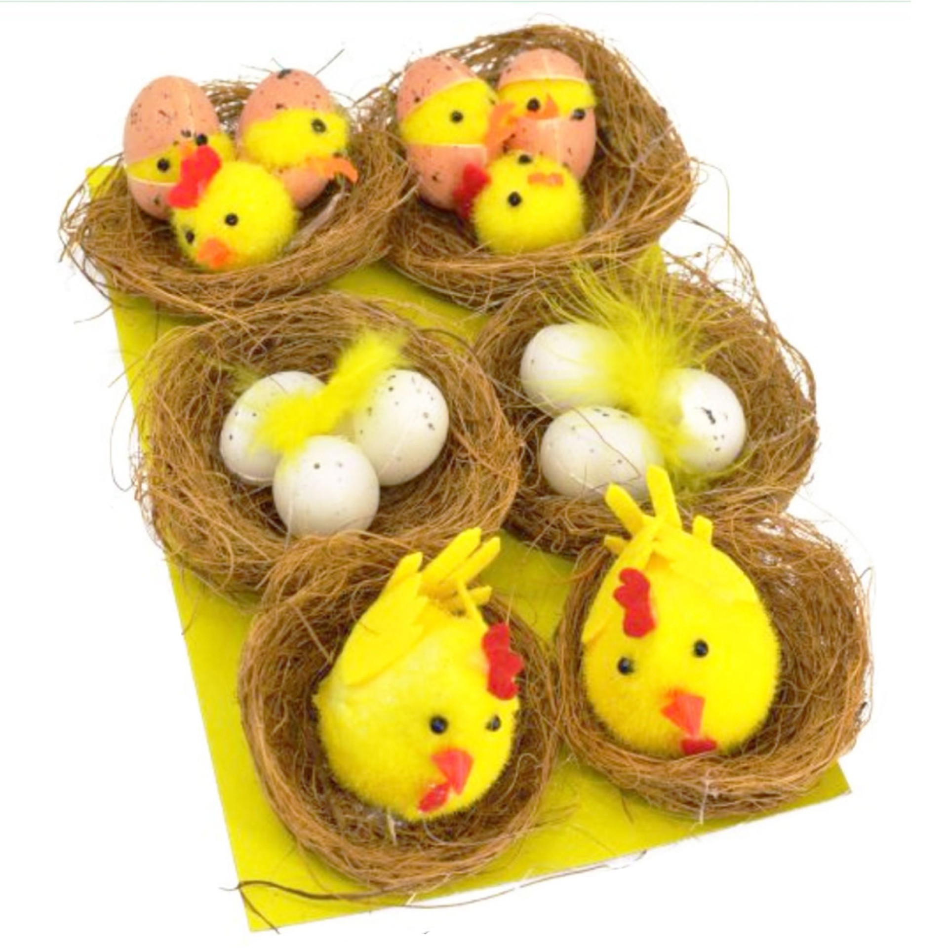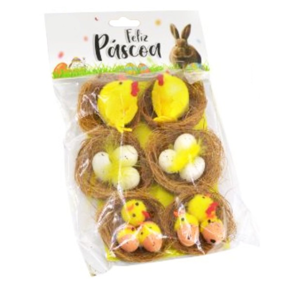 Pack com 6 ninhos com ovinhos e pintainhos. Cada ninho mede cerca de 5cm.Advertências