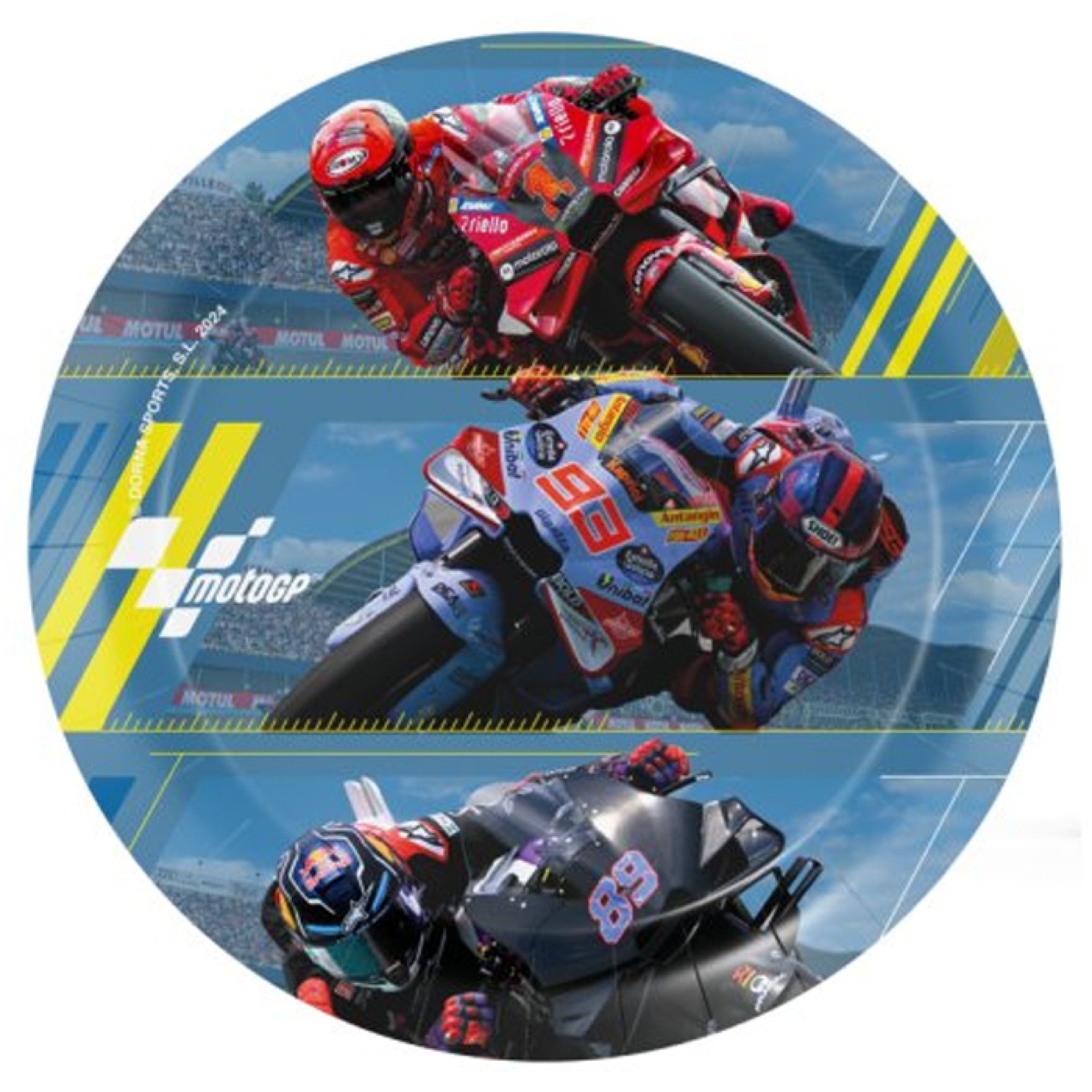 Pack com 8 pratos em papel de 18cm. Design Moto GP.Advertências