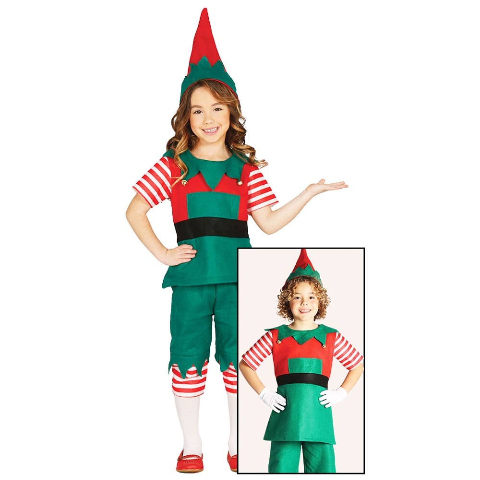Transforme a sua pequena em uma encantadora elfa do Natal com o disfarce Elfa Menina do Natal! Com um traje festivo e detalhes brilhantes, este disfarce é perfeito para festas temáticas e celebrações natalinas. Alegria e magia garantidas para uma experiência inesquecível! O fato é composto por camisola, calções com parte de baixo às riscas e gorro. Tecido feltro. Não inclui restantes adereços.