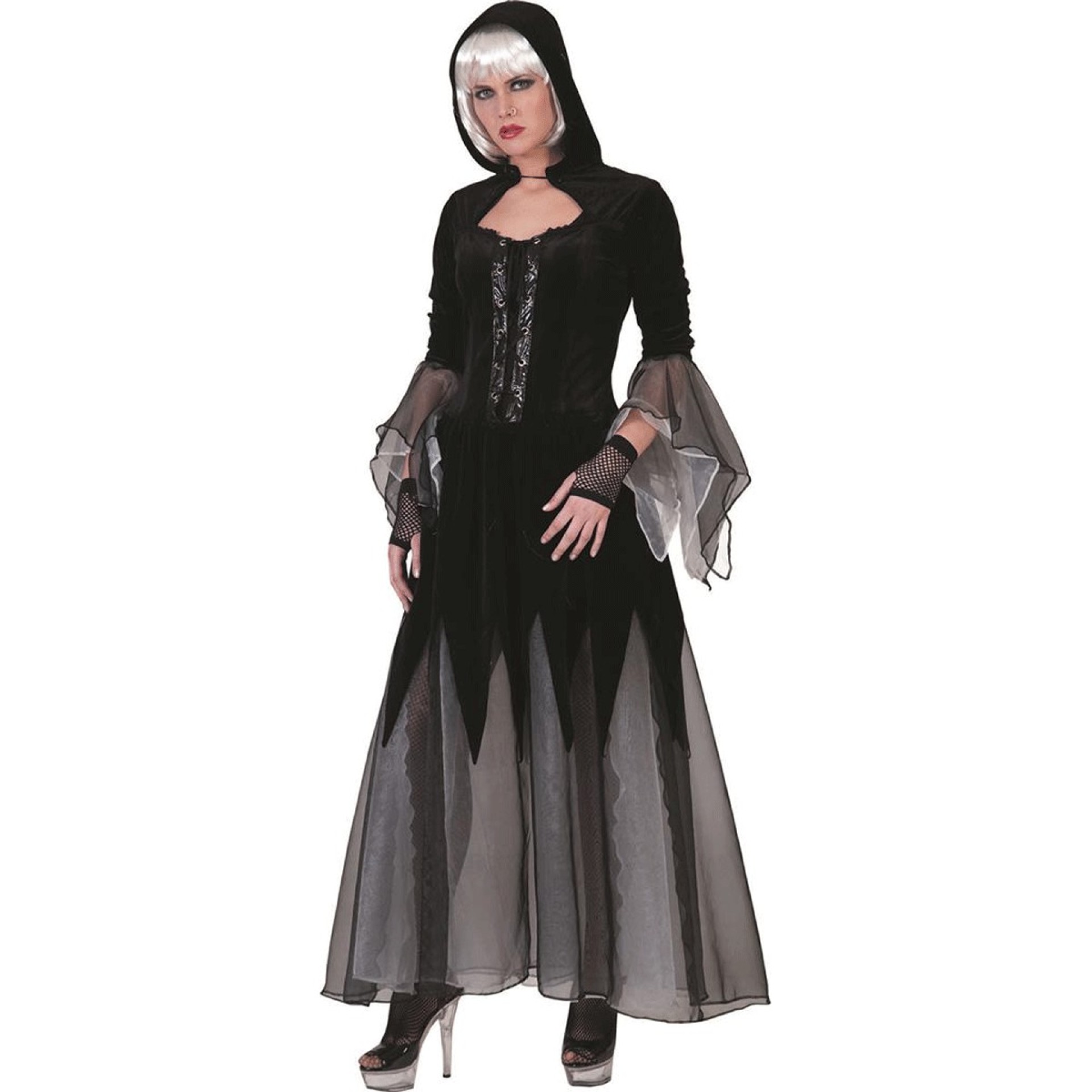 Fantástico Fato Gothic Dark Witch composto por vestido com capuz. Demais acessórios não incluídos.Dados Técnicos