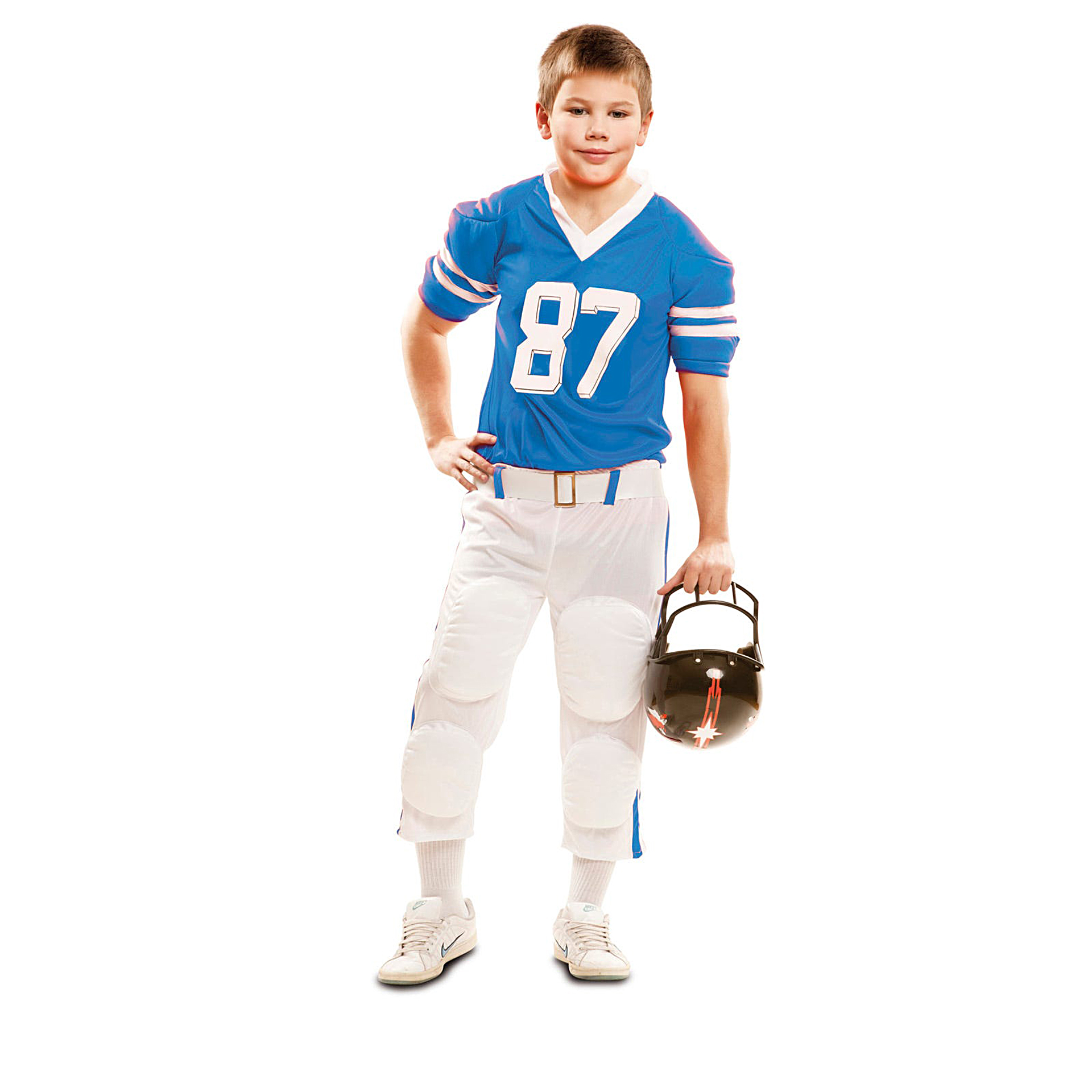 Preparado para entrar em campo? O Fato Jogador Rugby USA Menino. O disfarce inclui camisola almofada nos braços, calças almofadadas nos joelhos e cinto. Demais acessórios não incluídos.Dados Técnicos