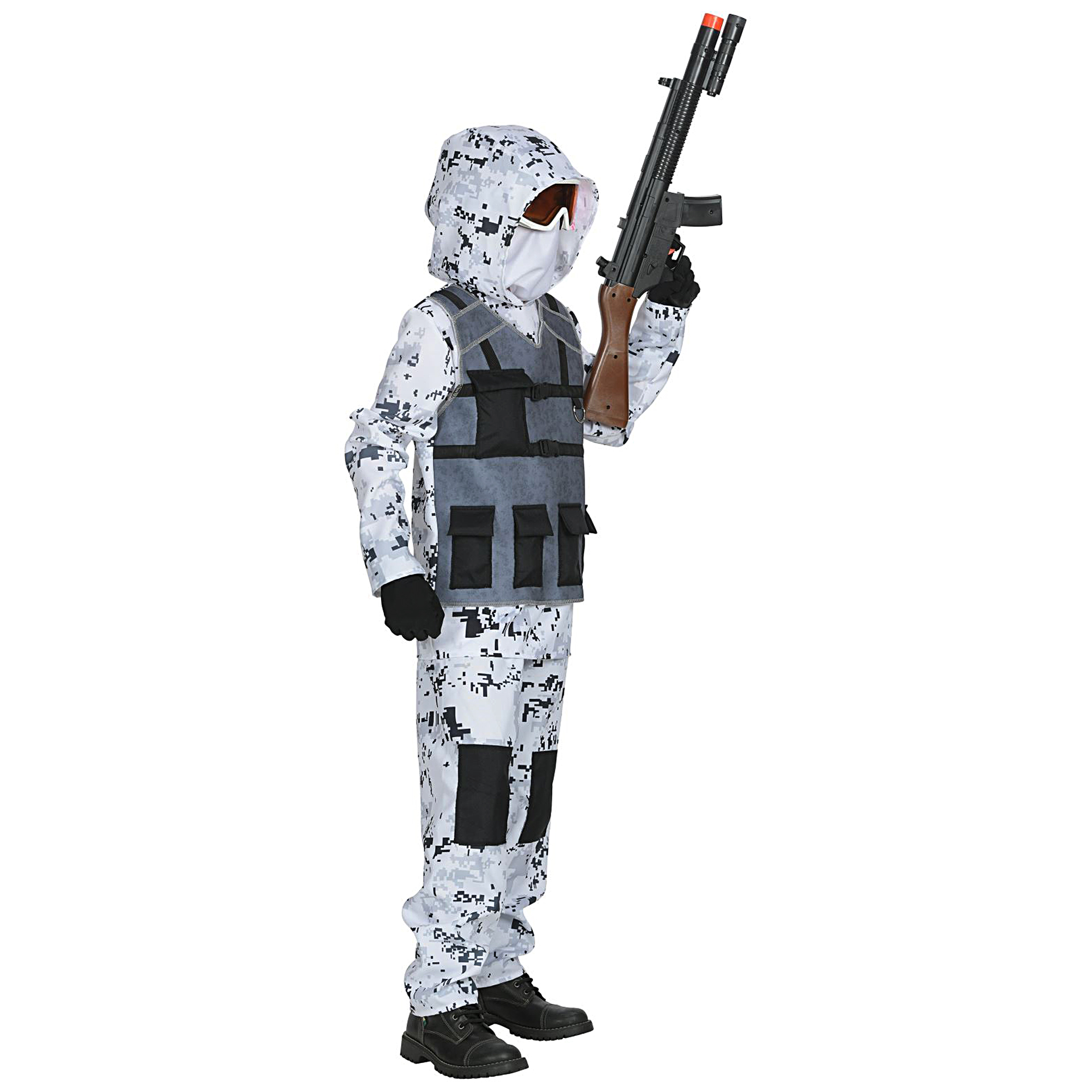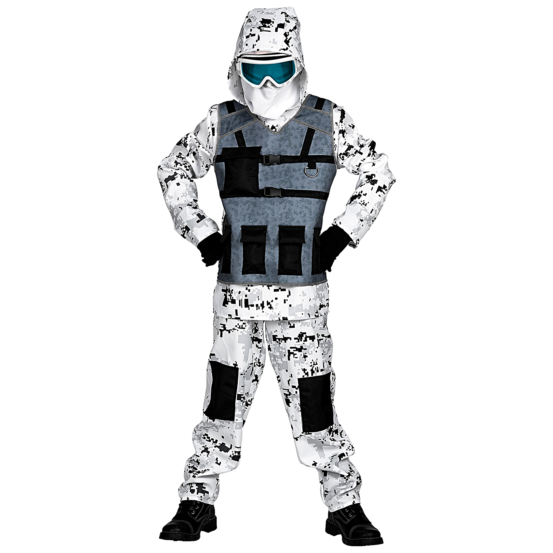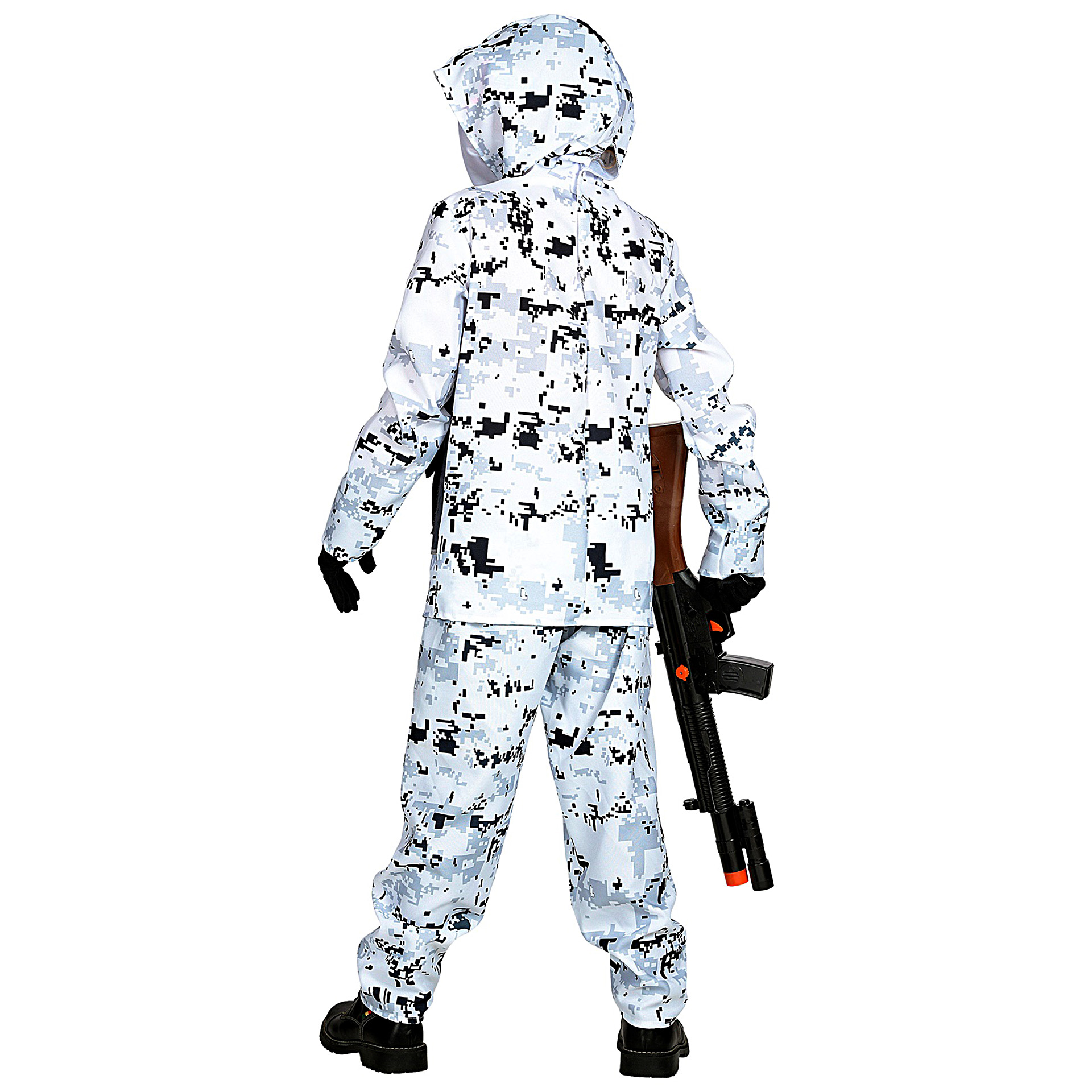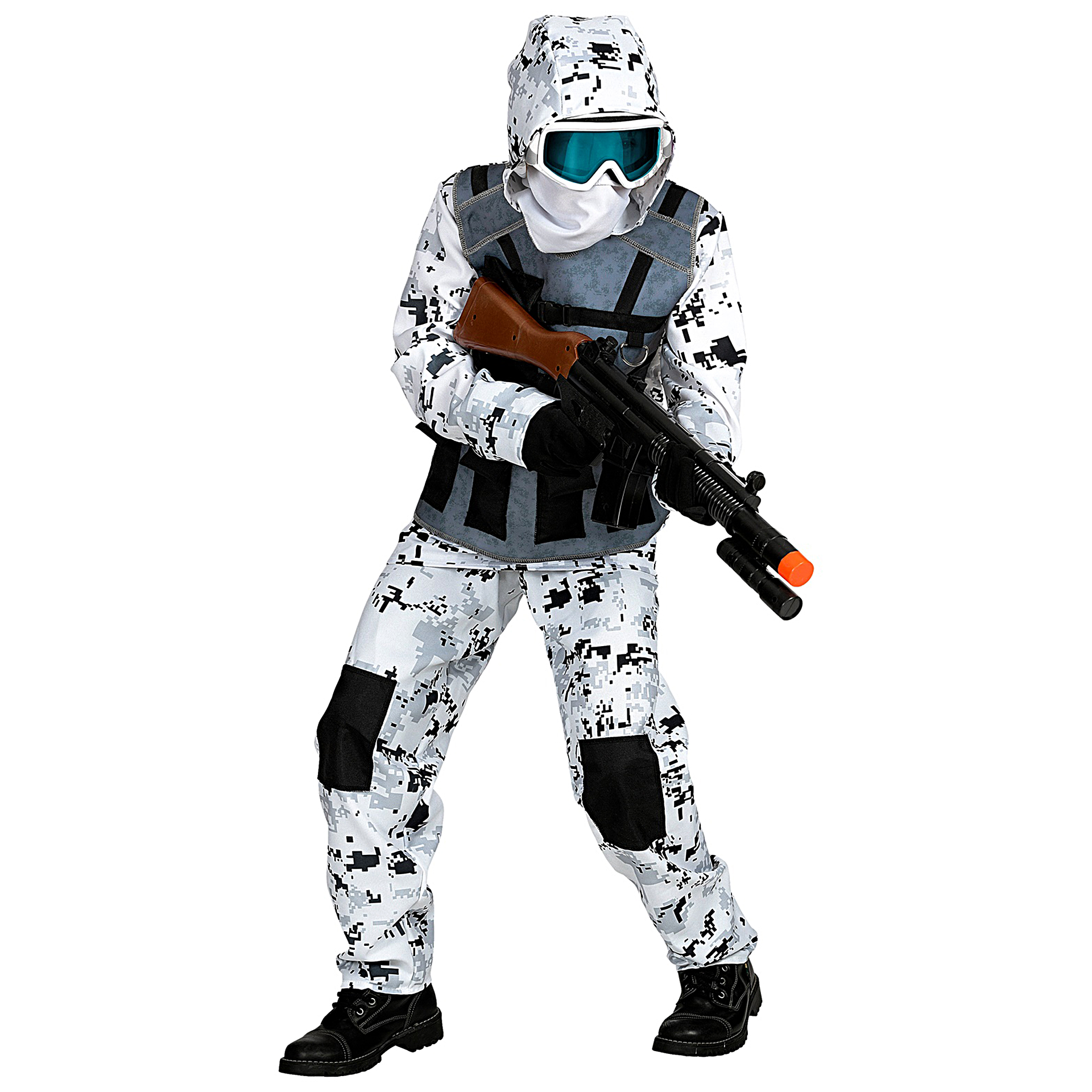 Fato Soldado Ice Storm é composto por camisola com capuz e colete anexados, calças e máscara para a cara. Demais acessórios não incluídos.Dados Técnicos