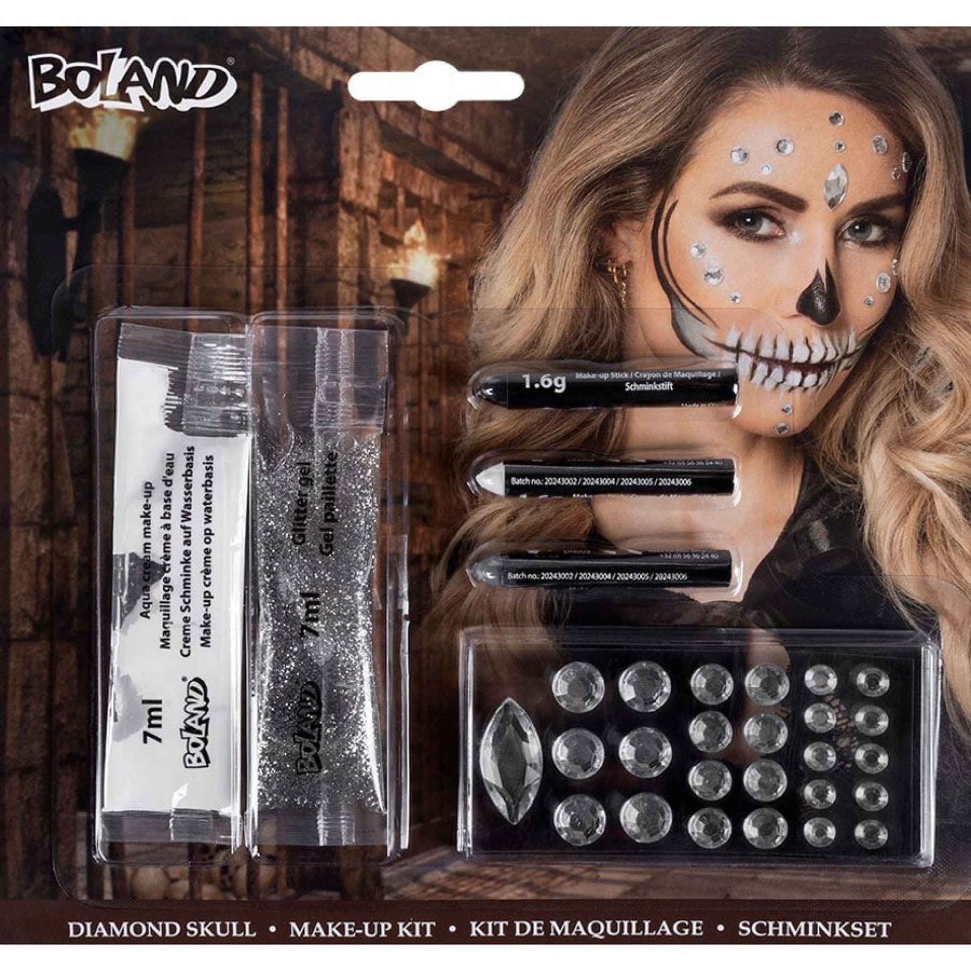 Kit perfeito para uma maquilhagem mais elegante e personalizada. Composto por brilhantes, 3 lápis, glitter e base em creme. Ideal  para complementar os seus disfarces e não só. Pedrinhas brilhantes para efeitos cintilantes. Auto-adesivo. Retire os brilhantes da folha de suporte e pressione firmemente sobre a pele limpa. Para uso repetido, use cola cosmética. Aplique a cola com moderação nos brilhantes e pressione na zona que pretende cola-los. Deixe secar um pouco. Termine com glitter.